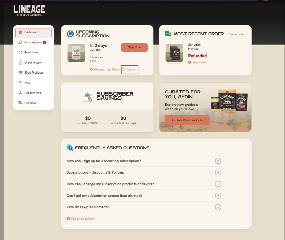 From your Dashboard, locate your Upcoming Subscription.